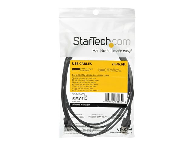StarTech.com Câble de Chargement 2m USB A vers USB C - Cordon USB 2.0 vers USB-C à Charge/Synchronisation Rapides - Gaine TPE en Fibre Aramide M/M 3A Noir - Samsung S10/iPad Pro/Pixel (RUSB2AC2MB) - Câble USB - USB (M) droit pour 24 pin USB-C (M) droit - Thunderbolt 3 / USB 2.0 - 2 m - noir - pour P/N: CDP2HDUACP2, SECTBLTDT, STNDTBLTMOB